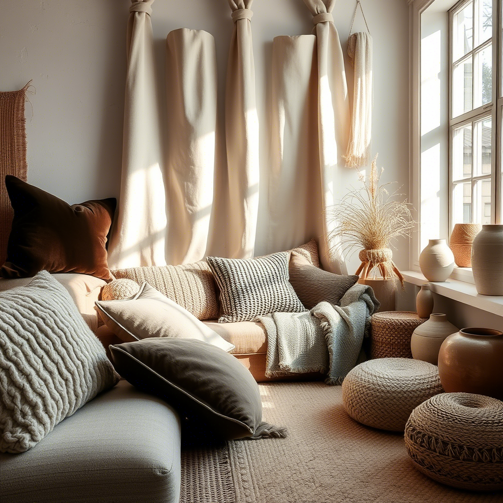 Mélangez les textures : velours tricoté, bouclé, lin froissé, laine brute, céramique rugueuse. Ces contrastes tactiles enrichissent l’expérience de l’espace et créent une atmosphère chaleureuse et enveloppante qui engage tous nos sens.