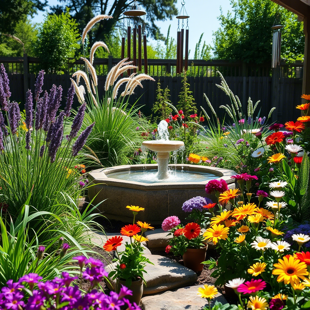 Concevez un espace qui stimule tous les sens avec des plantes aromatiques, des textures variées et des couleurs apaisantes. Intégrez la menthe, la lavande, le thym et des graminées douces au toucher. Ajoutez des éléments sonores comme des carillons éoliens ou une petite fontaine pour créer une ambiance relaxante.