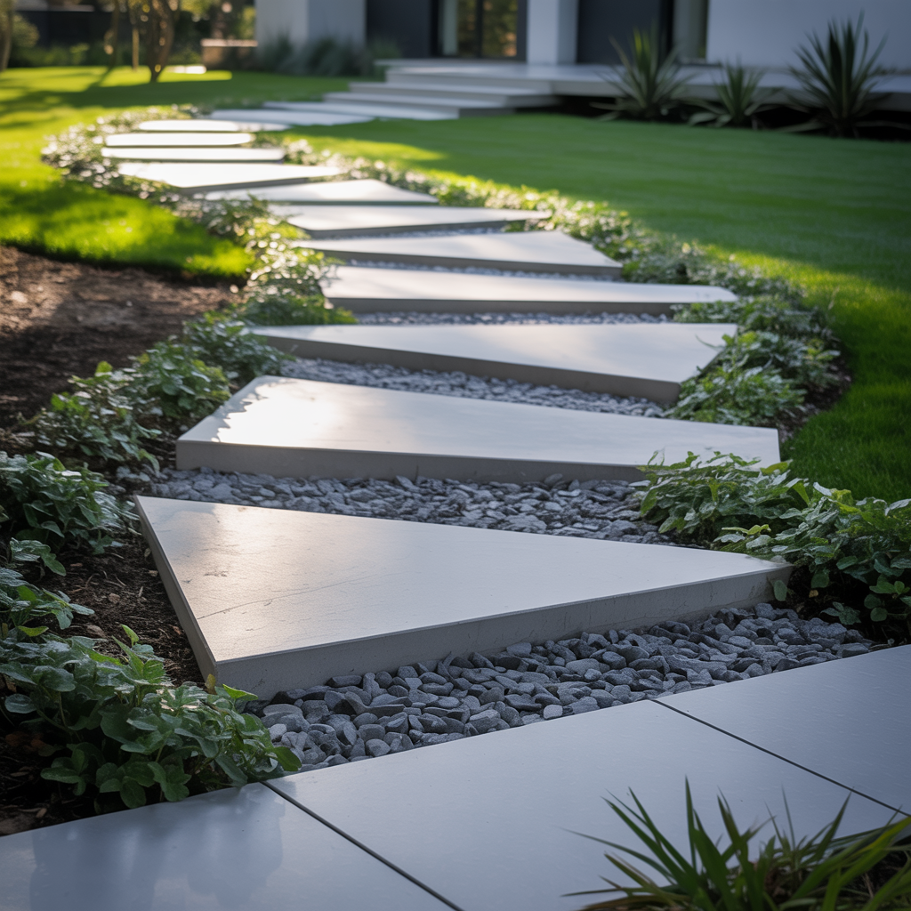 Remplacez votre allée traditionnelle par des dalles de béton ou de pierre naturelle disposées de manière asymétrique sur un lit de galets ou de gravier décoratif. Cette technique crée un effet visuel saisissant tout en permettant à l’eau de s’infiltrer naturellement. L’espace entre les dalles peut être agrémenté de plantes couvre-sol ou de mousse pour un rendu plus naturel.