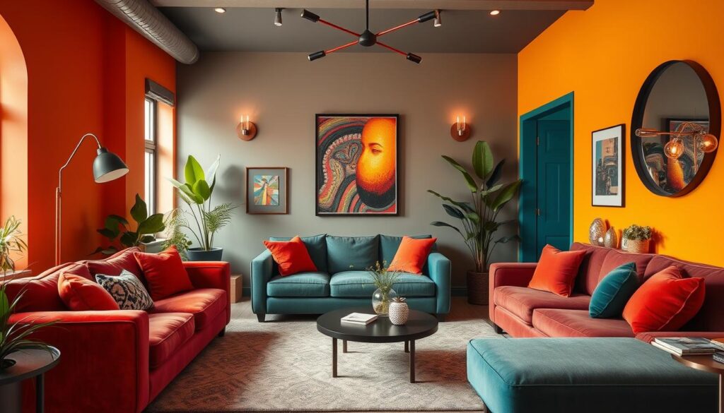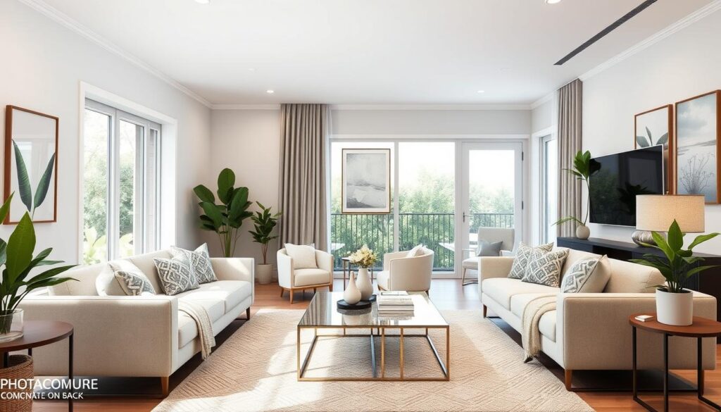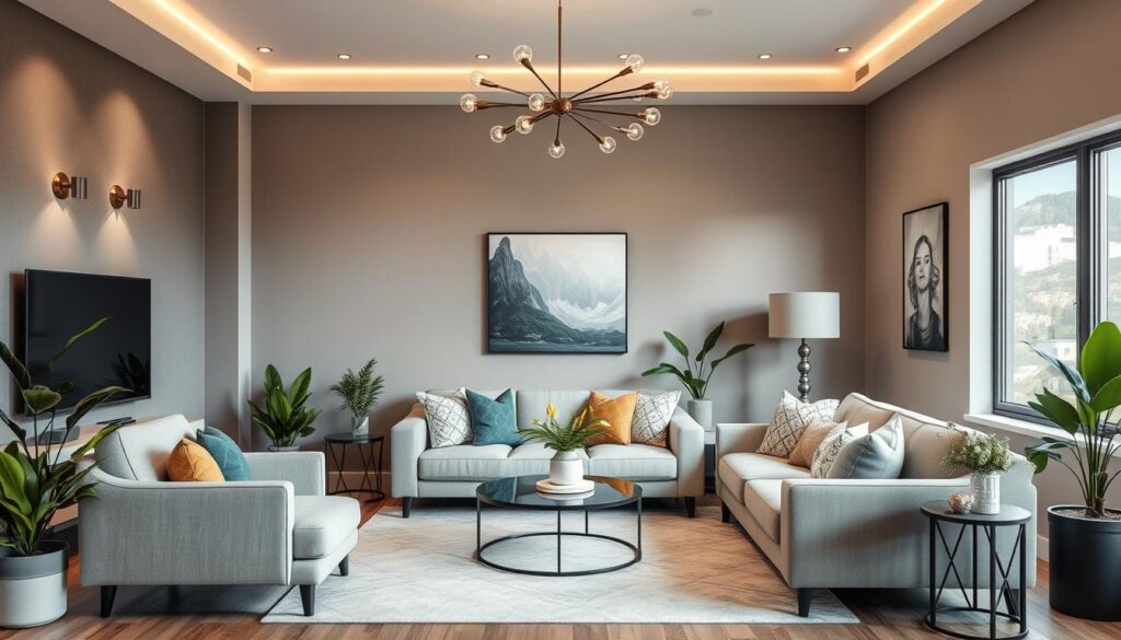 Dans un espace tendance, bien disposer les meubles est crucial. Cela crée une ambiance chaleureuse et fonctionnelle. Un aménagement salon bien fait peut changer votre pièce. Il optimise l’espace et facilite la circulation.