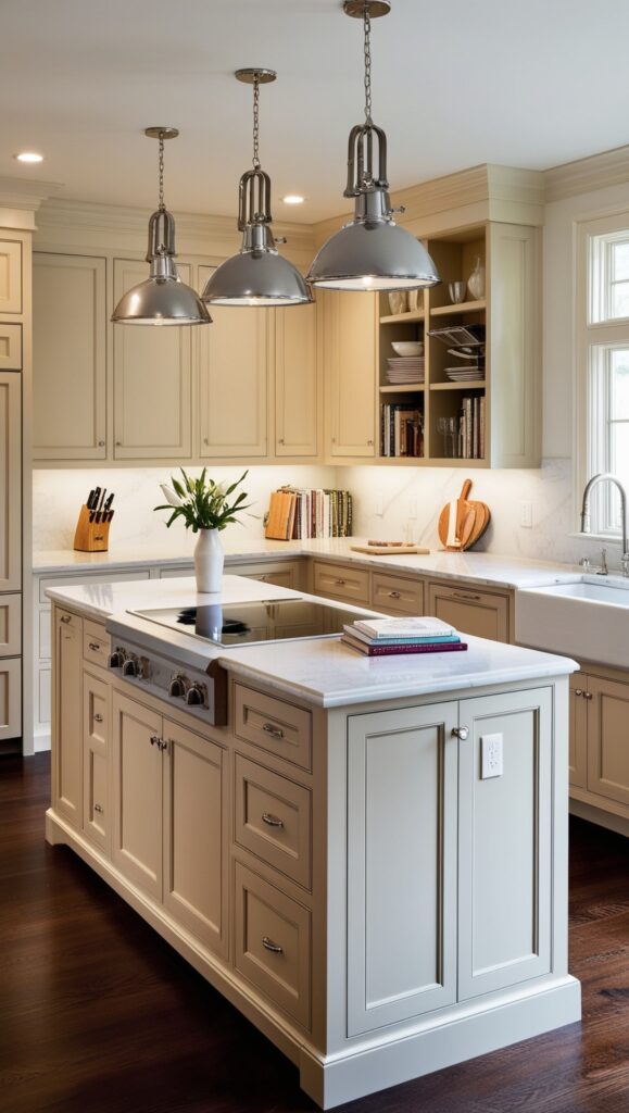 Conçus pour maximiser l’espace, les îlots centralisent préparation, rangement et convivialité. Certains modèles intègrent même des plaques de cuisson ou des éviers .