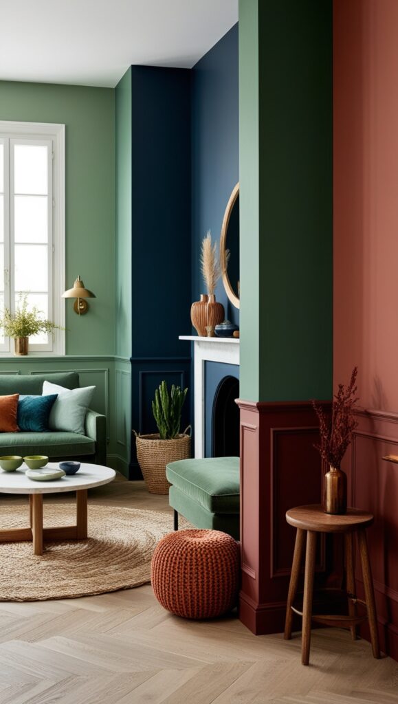 Adieu le blanc immaculé ! Place au vert sauge, bleu nuit et terracotta pour une ambiance sophistiquée. Le vert matcha et le bordeaux s’imposent aussi, créant des contrastes saisissants avec des éléments en bois ou en métal .